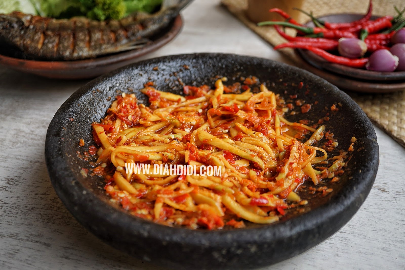150 gr mangga potong korek api 5 butir bawang merah cincang halus 2 siung bawang putih haluskan 8 buah cabai merah cincang halus 3 buah cabai rawit cincang halus 1 sdt garam cara. Letakkan cili dan belacan di dalam lesung dan alu dan tumbuk sehingga menjadi pes licin. 2 ekor 800 g ikan ayam ayaman segar2 sdm air jeruk nipis2 sdm minyak sayurhaluskan4 siung bawang putih2 butir.